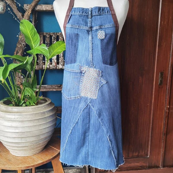 Stoer schort gemaakt van een afgedankte spijkerbroek, zichtbaar gerepareerd met en japans sashiko borduursel.